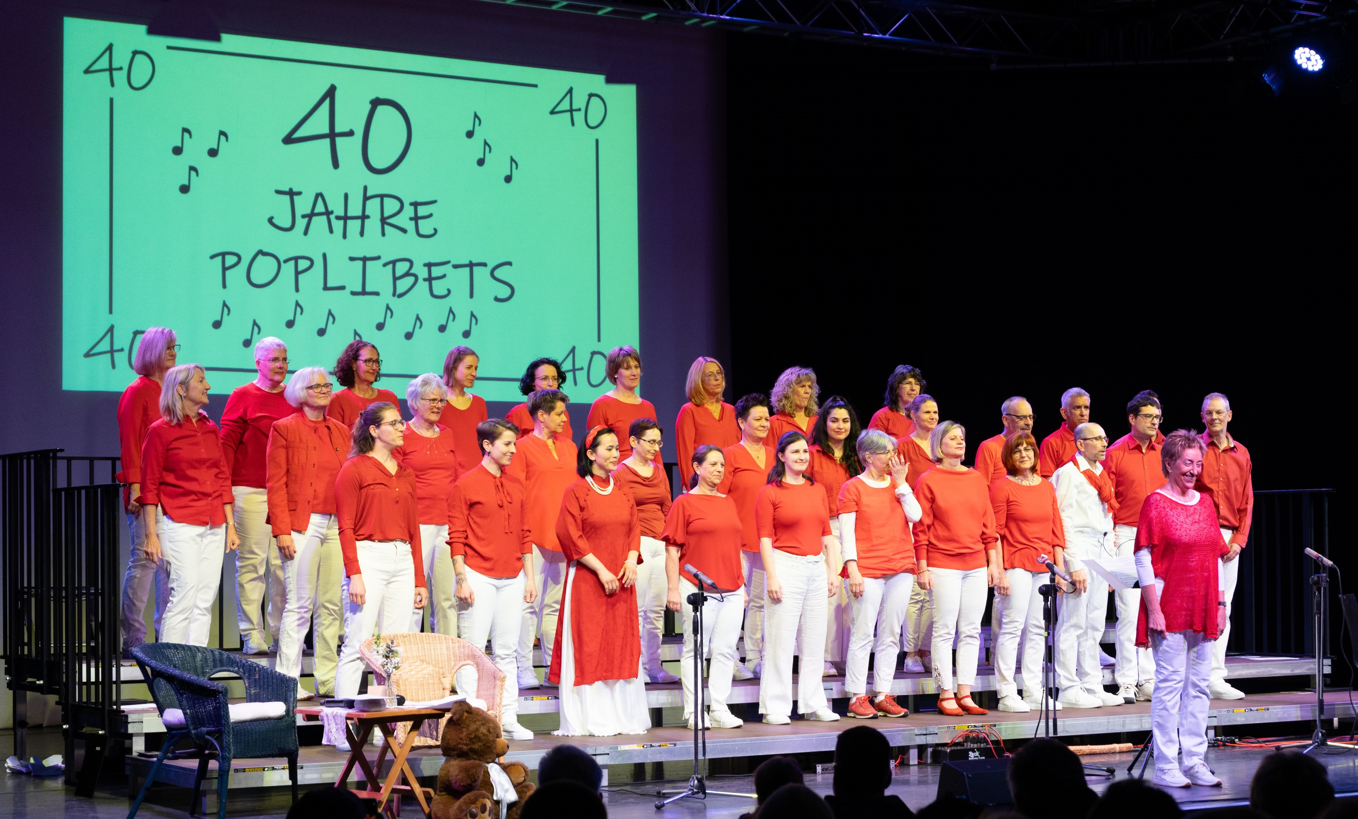 Bei den Poplibets singen ungefähr 35 Leute mit. Jedes Alter zwischen 25 und 70 Jahren ist vertreten. In unseren wöchentlichen Singstunden und gelegentlichen Singtagen bereiten wir uns auf unsere Konzerte vor.